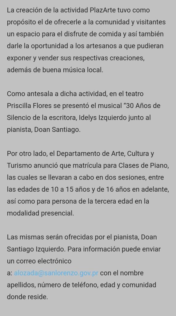 Por otro lado, el Departamento de Arte, Cultura y Turismo anunció la matrícula para clases de piano, las cuales se Ilevarán a cabo en dos sesiones, entre las edades de diez a quince años y de 16 años en adelante, así como para persona de la tercera edad en la modalidad presencial. El recurso Doan Santiago Izquierdo impartirá el curso. Para información, puede enviar un correo electrónico a: alozada@sanlorenzo.gov.pr con el nombre apellidos, número de teléfono, edad y comunidad donde reside.