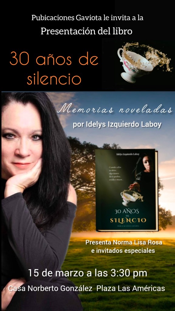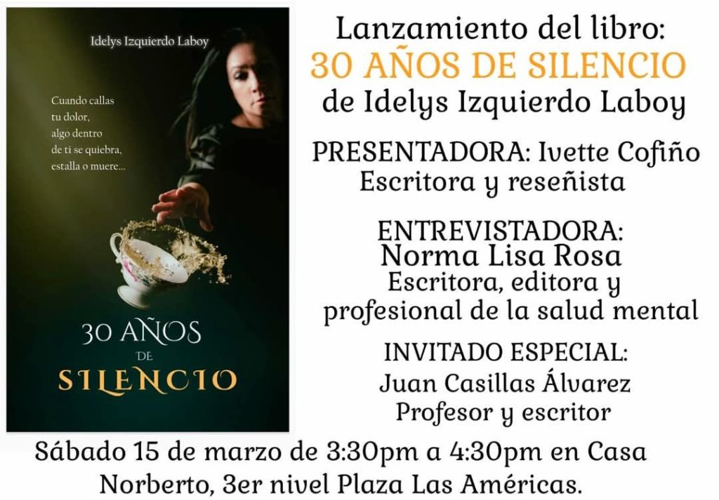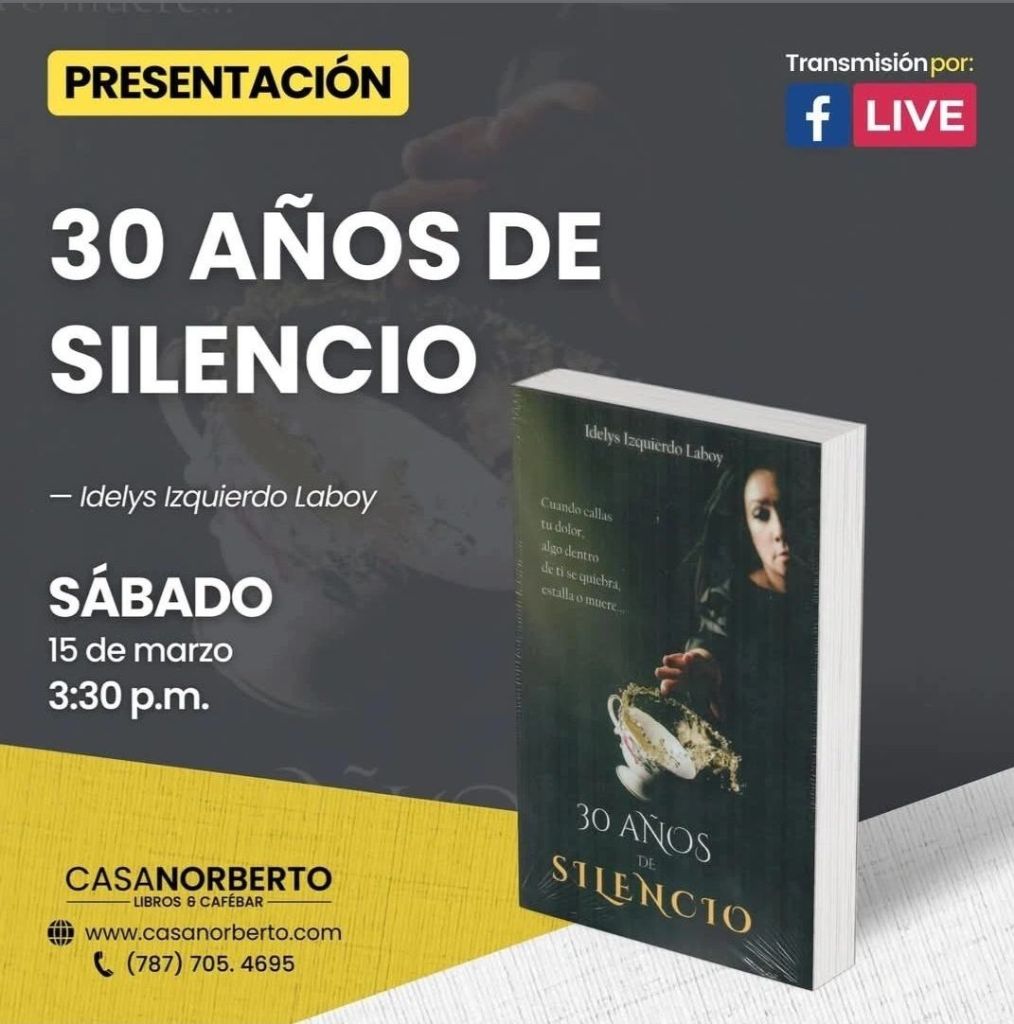 Libro 30 años de silencio: Memorias noveladas de la autora Idelys Izquierdo Laboy. La protagonista Deliris, quien perdió a su madre siendo una niña de seis años, comenzó a buscar respuestas sobre su inesperada y misteriosa muerte. Esperó treinta años para romper el silencio, soltar el dolor y restaurar su corazón.En este libro la autora comparte sus dramáticas vivencias, llenas de lágrimas, incertidumbre, locura y muerte. Vivencias que mezclan la fantasía con la realidad, el bien con el mal, la luz con la oscuridad.El suicidio, el abuso sexual y la violencia doméstica se entrelazan para tejer estas <<memorias noveladas». Autora Idelys Izquierdo Laboy¿En qué momento el hilo de la verdad se rompe para dar paso a la mentira?